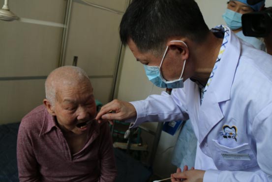 胡主任檢查何奶奶牙齒后,向魏阿姨介紹,婆婆上頜牙齒缺失4顆,有6顆殘根,下頜3顆牙齒松動,2個殘根。胡主任建議盡量帶婆婆來院免費檢查,做進一步的治療。